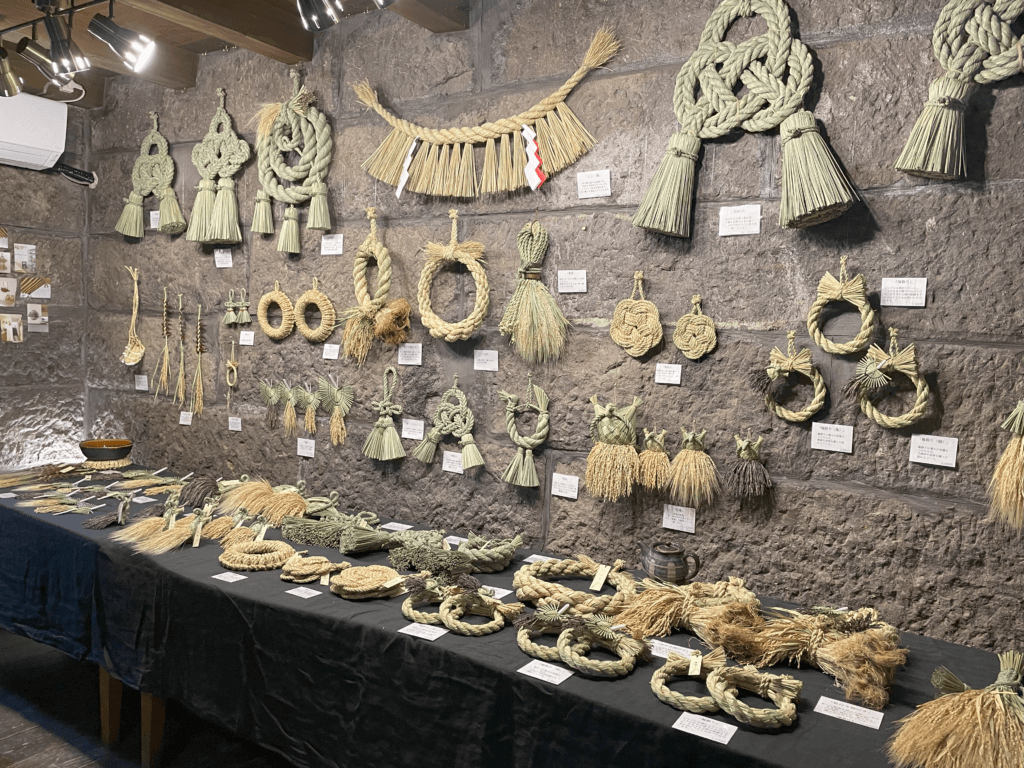 歴史を刻む石壁のひんやりとした質感とわらの温もりのある質感のコントラストをお楽しみいただける空間となります。展示しているわら細工は、その場でお買い求めいただけます。