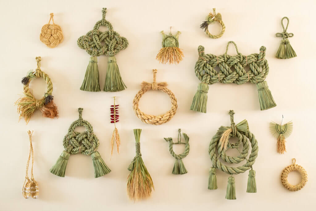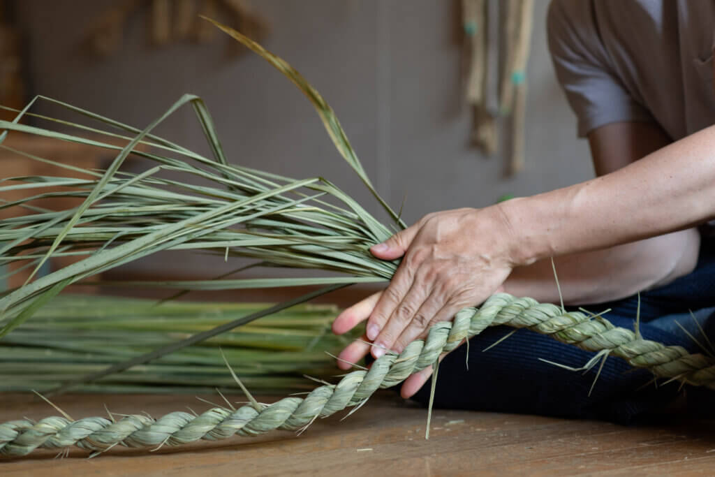 稲わらと青わらそれぞれの特徴を活かし、作るものに応じてわらの使い分けをしており、繊細なわら細工から大きな神社のしめ縄まで制作は多岐に渡ります。