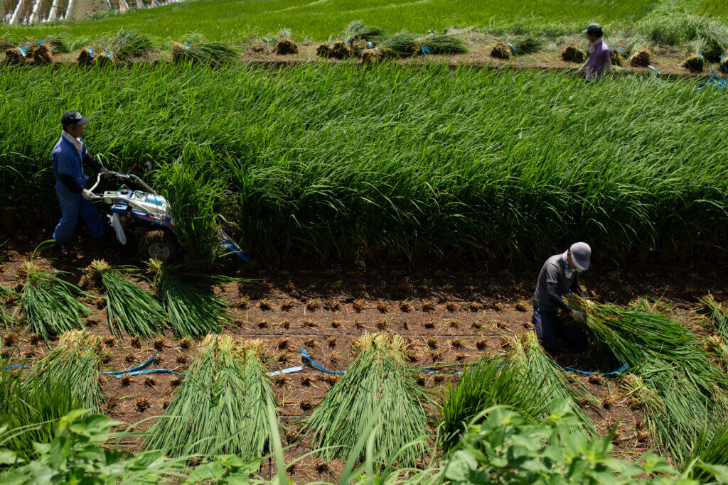 日中の暑い中、首辺りまで伸びた青わらはたいへん重たく、収穫作業は過酷を極めます。