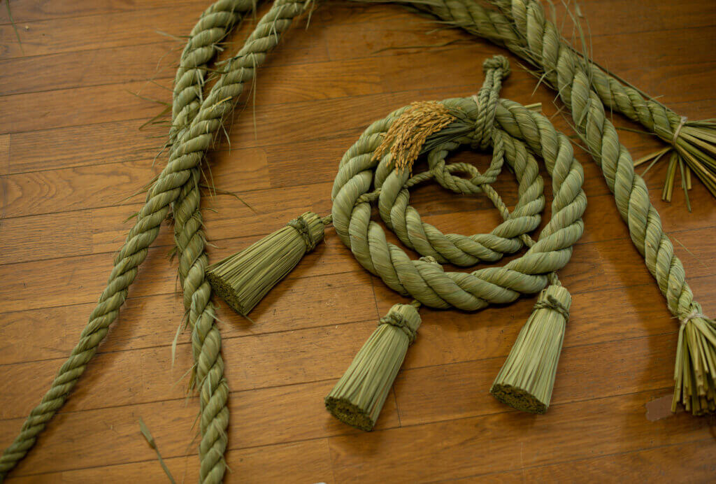 この地域では稲作が昔から営まれており、お米の副産物である稲わらは草履などの生活道具や五穀豊穣を願うしめ縄の材料に使われてきました。