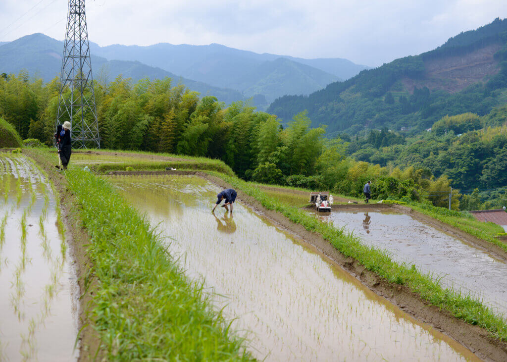 6月に代搔き(しろかき。田んぼに水を入れ、トラクターで土を砕いて平らにする作業)と田植えを済ませると、そこから毎日の水見(水管理のこと)が始まります。Episode.3でも触れましたが、用水の水が届くのは午前0時以降という決まりがあり、水が溜まる夜中の3時頃に水見をします。平野部と違い山間部の棚田で小さな田んぼがあちこちにたくさんあるため、毎日のことですから大変です。