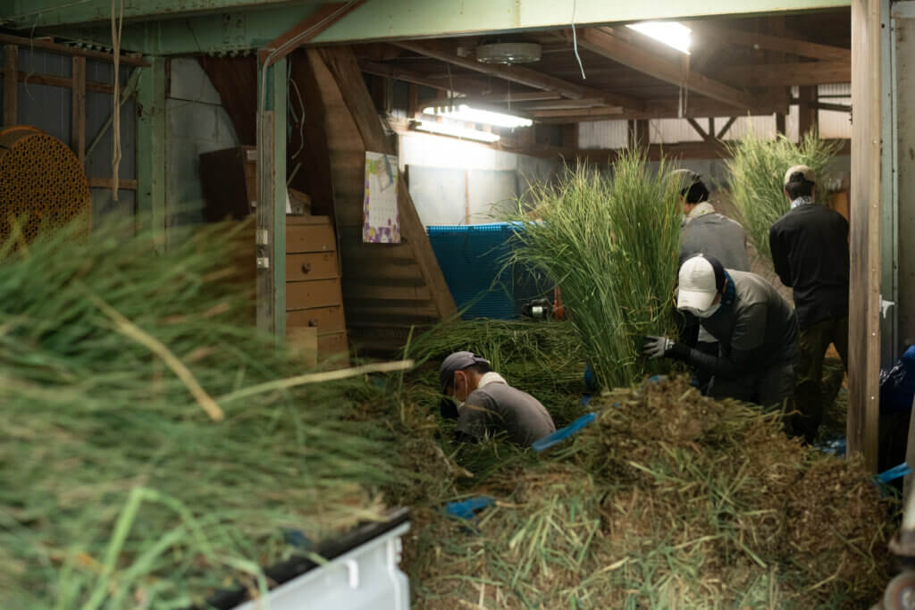 刈り取った青わらは乾燥機で機械乾燥しています。乾燥機小屋に舞う砂埃とも闘いながら、この工程を複数回繰り返すので体力的にもたいへんハードですし、天候や生育具合などあらゆる状況のわらを最高の乾燥状態に仕上げることも難しく、毎回挑戦です。
