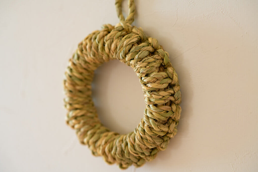 わら細工たくぼでは多種多様なわら細工を制作していますが、大きく分けて2種類のわらを使用しています。1つはお米の収穫・脱穀後にとれる「稲わら」、そしてもう1つお米が実る前に刈り取るわらも材料として使用しており、これを「青わら」と呼んでいます。
