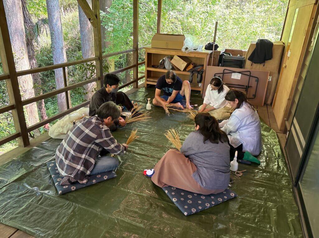 わら縄でできた芯に一本の縄で編み込み製作するワークショップです。紐一本残さず全てわらのみで仕上げます。