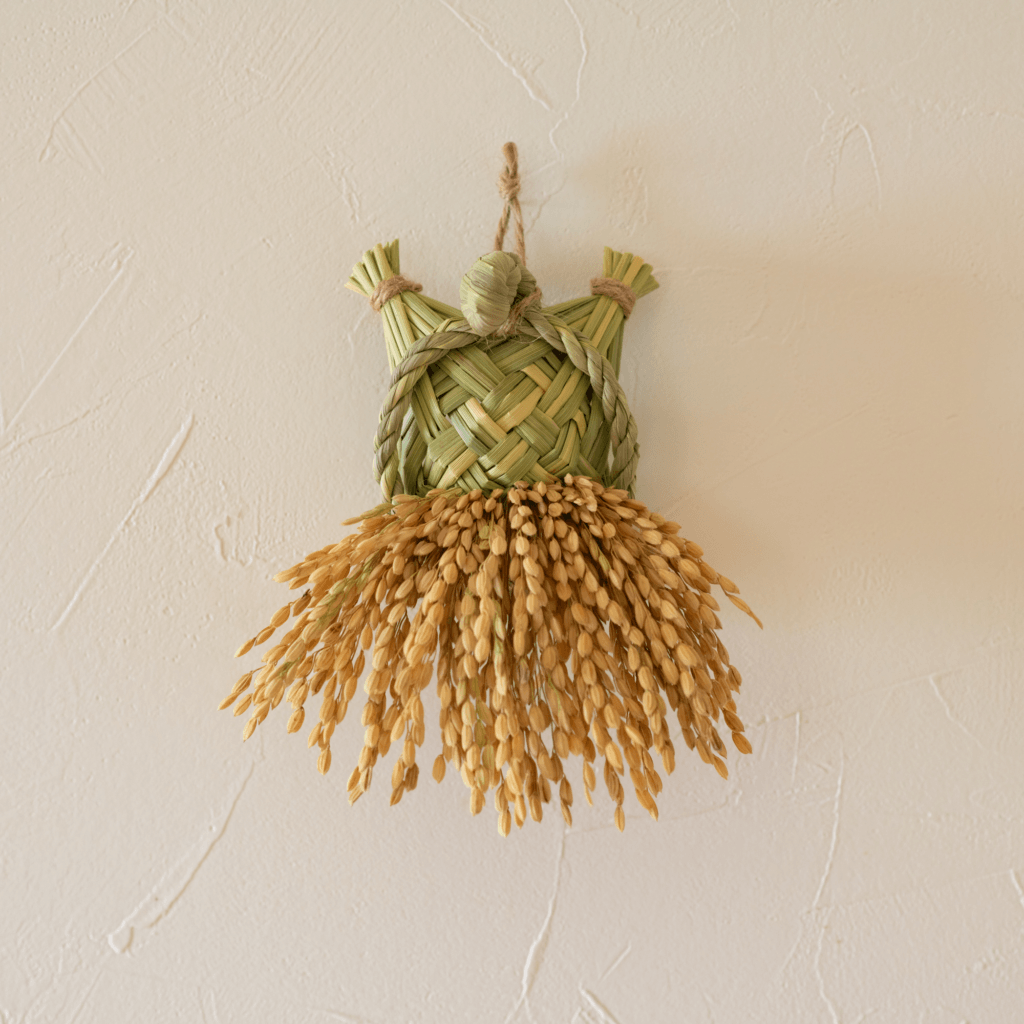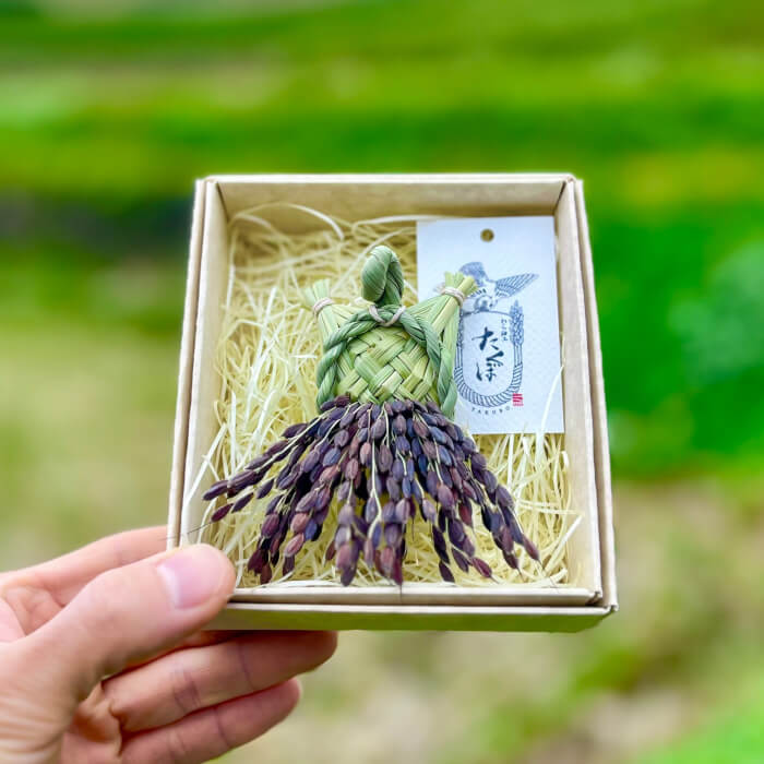 極小サイズの祝亀を作るワークショップです。縄を綯う工程と穂をさす工程を体験いただき、完成品は箱にお入れいたいます。