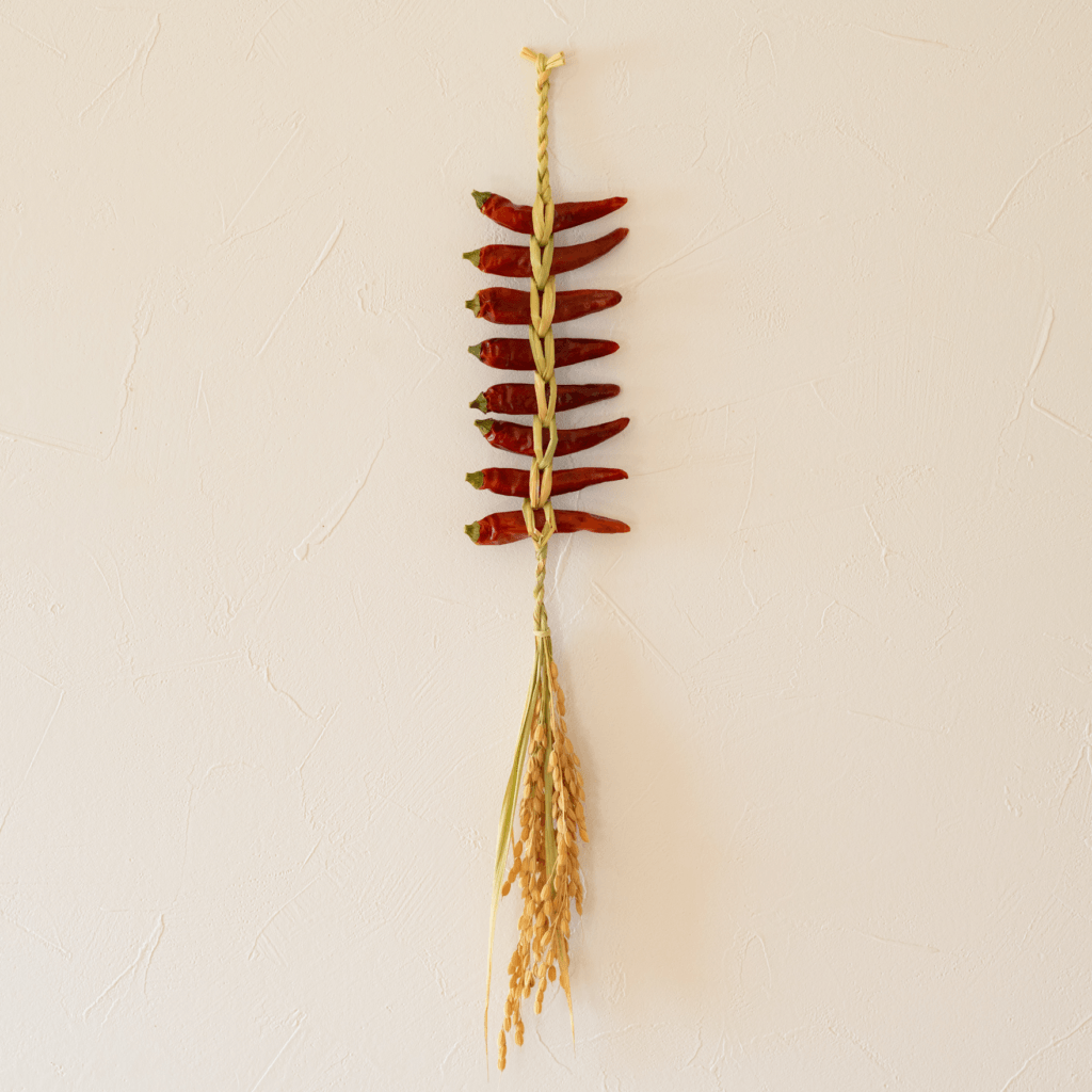悪意や悪運を払うとされる唐辛子を編み込んだ魔除けの飾りですが同時に幸せを呼ぶとも言われています。